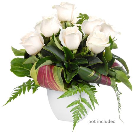 The Carmen is an arrangement that exudes beauty and grace. Elegantly presented in a ceramic pot, these ten creamy white roses accentuated with fern and cordyline are picked field fresh. Each pure white rose is inspected for perfection, down to the very last petal.