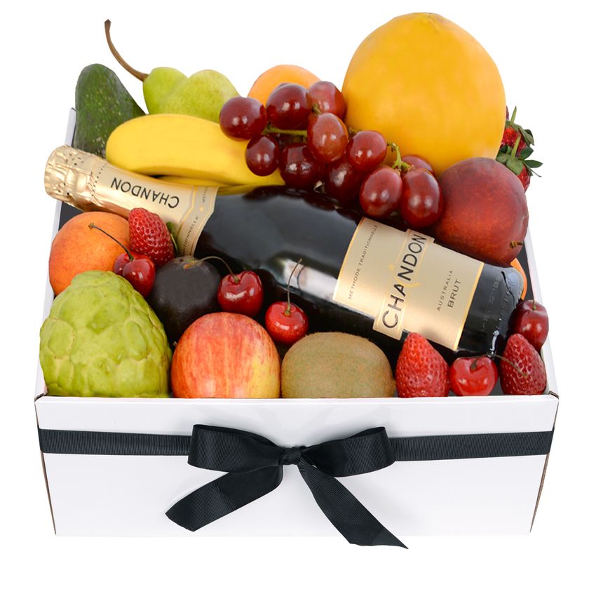 This box is filled with a delicious selection of healthy, fresh fruit and comes complete with a bottle of sparkling Chandon. With a mix of cherries, passionfruit, bananas, pawpaw and more, this box is perfect for any occasion!